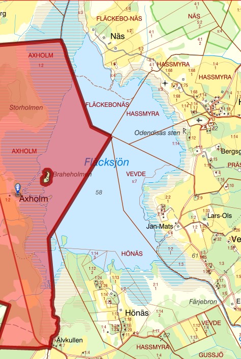 Fiskekortet gäller i hela det samfälda fiskevårdsområdet i Fläcksjön. Axholms fiskevatten ingår ej och är rödmarkerat på nedanstående karta.